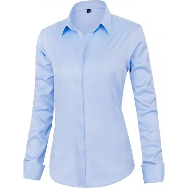 A long-sleeve women’s shirt for office, commuter, and smart-casual wear. Stretch fabric keeps it comfortable and wrinkle-resistant for all-day wear. Regular fit and classic shirt collar suit tucking in or wearing out. Good for uniforms, corporate merch, and bulk orders.